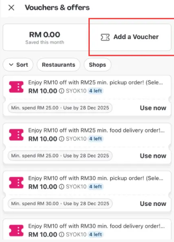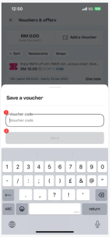 Langkah 5: Navigasi ke tab “Tambah Baucar”. Di sini, salin dan tampal kod kad hadiah Foodpanda yang anda terima daripada SEAGM ke dalam medan input, kemudian ketik “Simpan”.