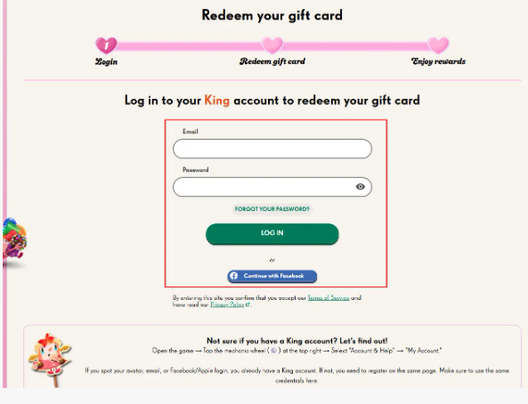 [i] Jika anda tidak mempunyai akaun King, buka aplikasi permainan Candy anda dan pergi ke [Akaun Saya] untuk membuat atau memautkannya. Anda boleh log masuk menggunakan e-mel atau Facebook anda. Setelah akaun anda disediakan, kembali ke halaman penebusan King dan log masuk.
