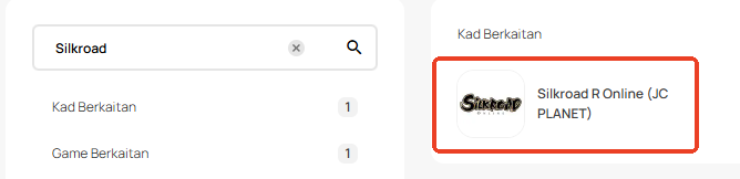Langkah 1: Log masuk atau daftar untuk akaun dalam SEAGM. Pada menu atas, masukkan kata kunci "Silkroad" dan cari. Pilih "Silkroad R Online [JC PLANET]".