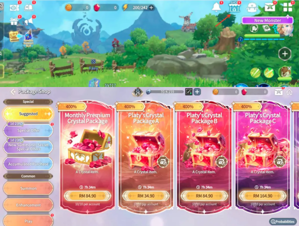 Langkah 2: Pasang dan mulakan aplikasi, ketik ikon "Shop", kemudian pilih pakej kristal pilihan anda.