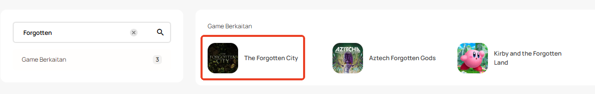 Langkah 1: Log masuk/daftar akaun dalam SEAGM. Pada menu atas, masukkan kata kunci "Forgotten" dan cari. Pilih "The Forgotten City".