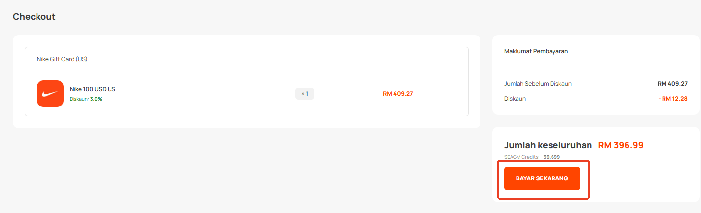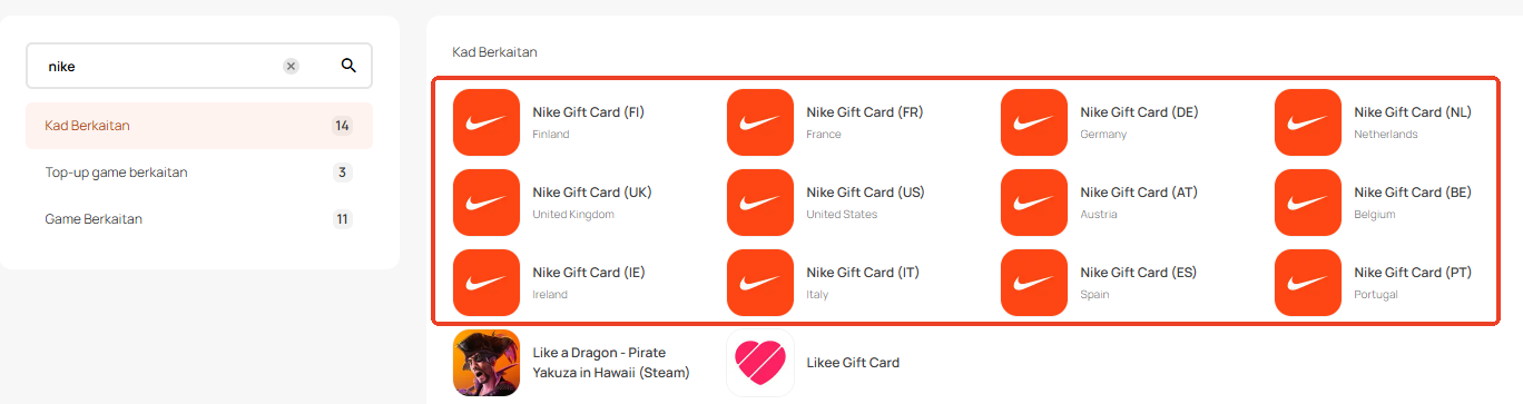 - Nike Gift Card yang dijual di SEAGM merupakan kad yang dikunci mata wang rantau.