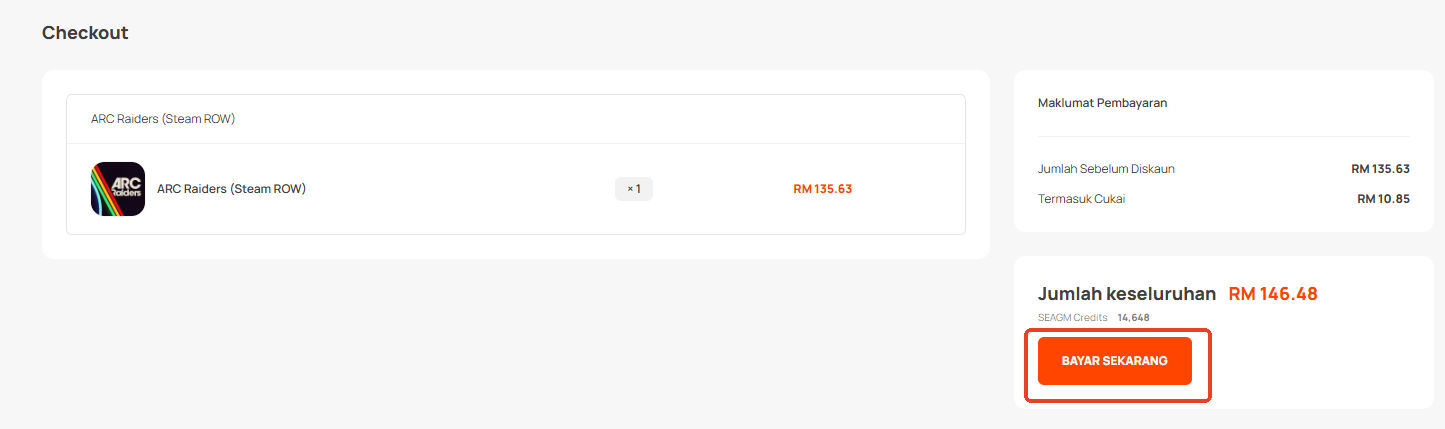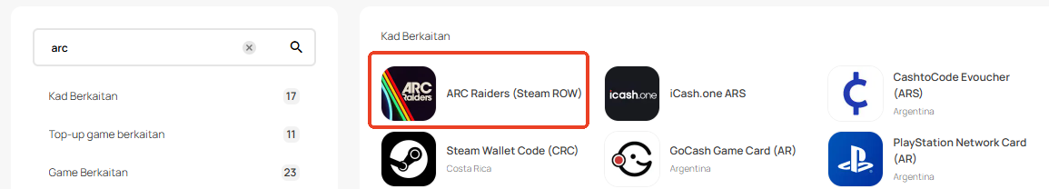 Langkah 1: Log masuk atau daftar untuk akaun dalam SEAGM. Pada menu atas, masukkan kata kunci "Arc" dan cari. Pilih "ARC Raiders (Steam ROW)".