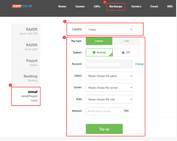 Langkah 3: Selepas log masuk, klik [Caj Semula], pilih [Turki], dan pilih kaedah pembayaran Kad Prabayar Awal.