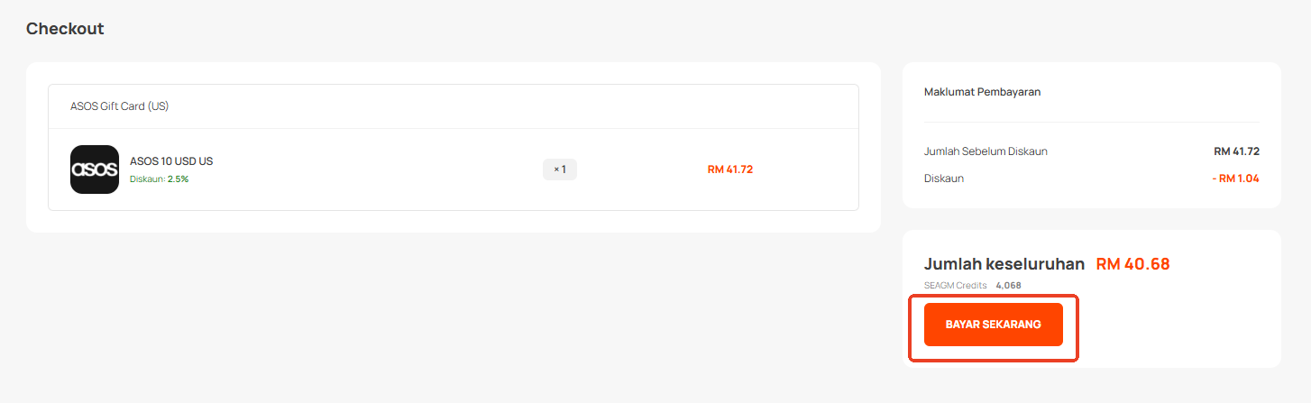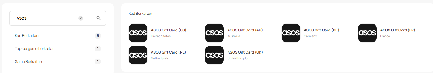 Notis Penting: ASOS Gift Card yang dijual oleh SEAGM adalah terhad kepada wilayah dan mata wang. Semua pembelian adalah muktamad dan tidak boleh dikembalikan atau dipulangkan.