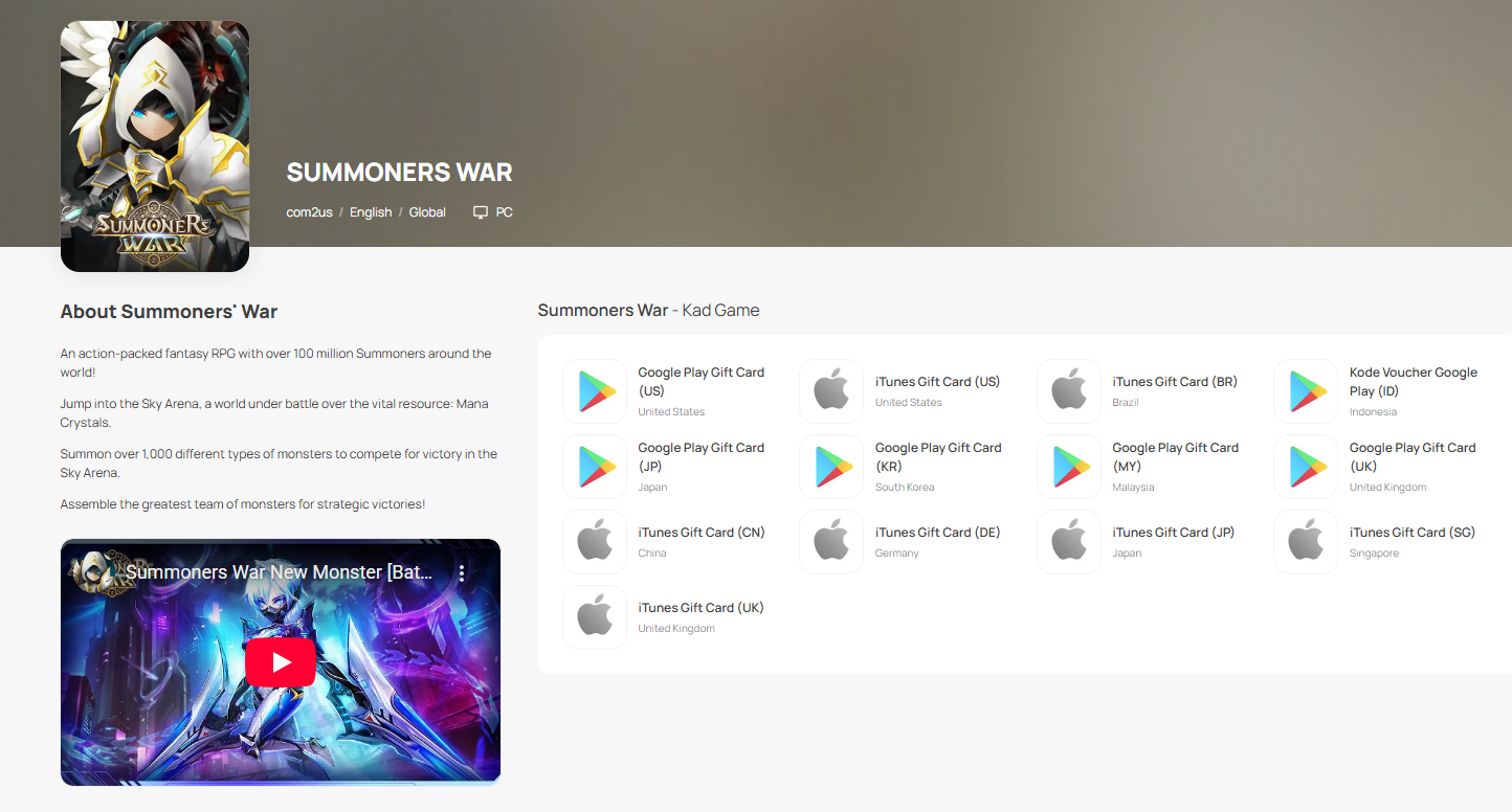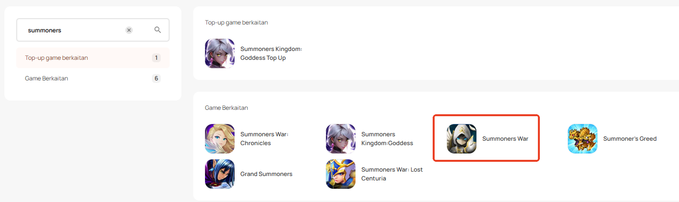 Langkah 1: Log masuk/daftar akaun dalam SEAGM. Pada menu atas, masukkan kata kunci "Summoners" dan cari. Pilih " Summoners War".