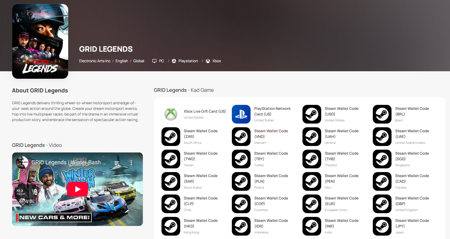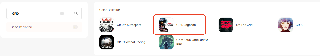 Langkah 1: Log masuk atau daftar untuk akaun dalam SEAGM. Pada menu atas, masukkan kata kunci "GRID" dan cari. Pilih "GRID Legends".