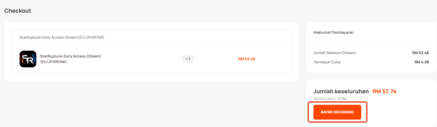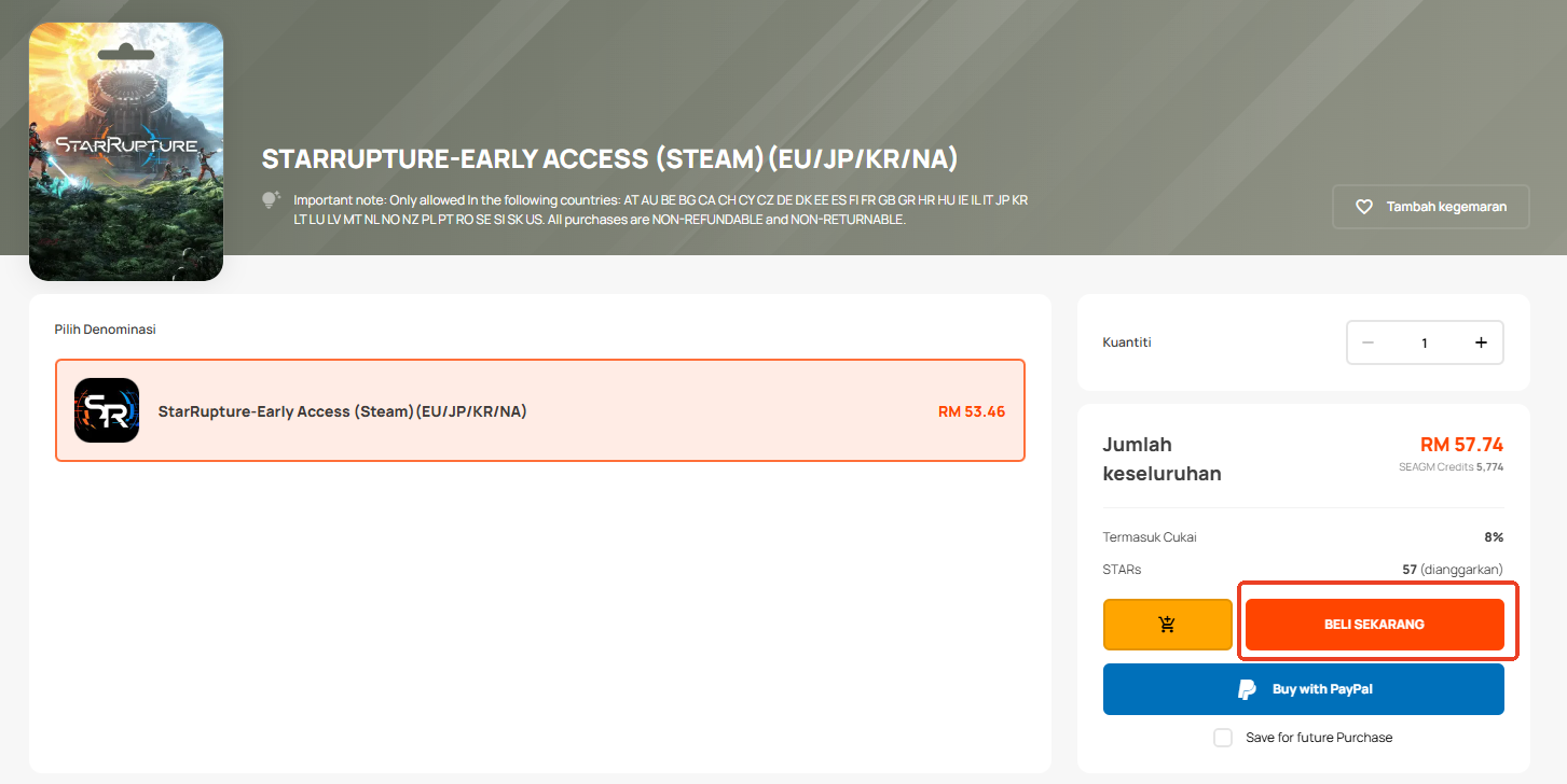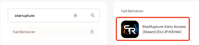 Langkah 1: Log masuk atau daftar untuk akaun dalam SEAGM. Pada menu atas, masukkan kata kunci "Starrupture" dan cari. Pilih "StarRupture-Early Access (Steam)(EU/JP/KR/NA)".
