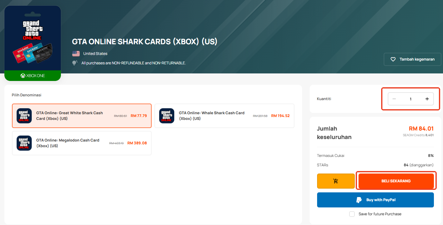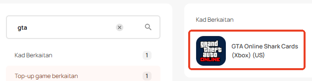 Langkah 1: Log masuk atau daftar untuk akaun dalam SEAGM. Pada menu atas, masukkan kata kunci dan cari "GTA". Pilih "GTA Online Shark Cards (Xbox) (US)".