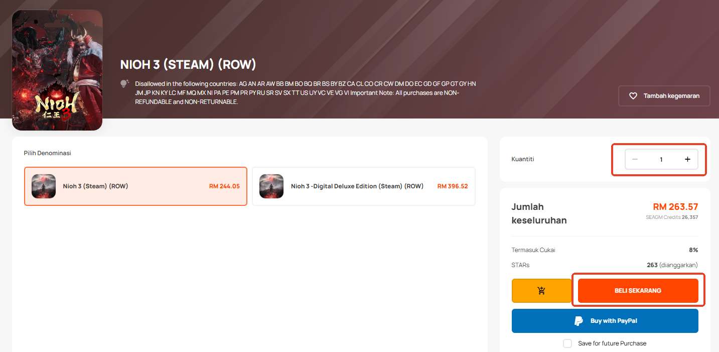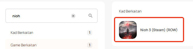 Langkah 1: Log masuk atau daftar untuk akaun dalam SEAGM. Pada menu atas, masukkan kata kunci "Nioh" dan cari. Pilih "Nioh 3 (Steam) (ROW)".