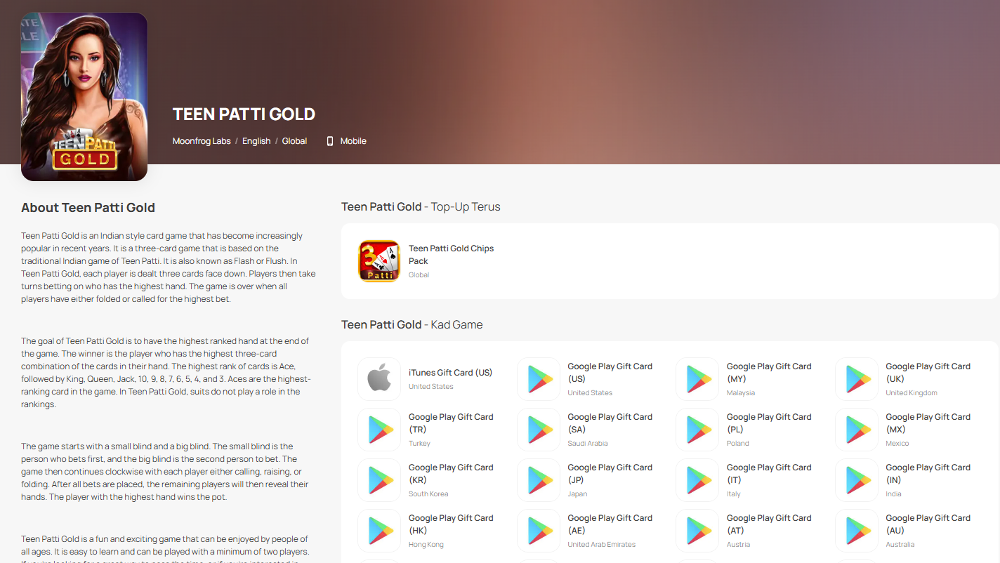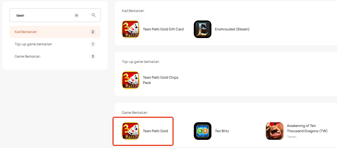 Langkah 1: Log masuk atau daftar untuk akaun dalam SEAGM. Pada menu atas, masukkan kata kunci "Teen" dan cari. Pilih "Teen Patti Gold".