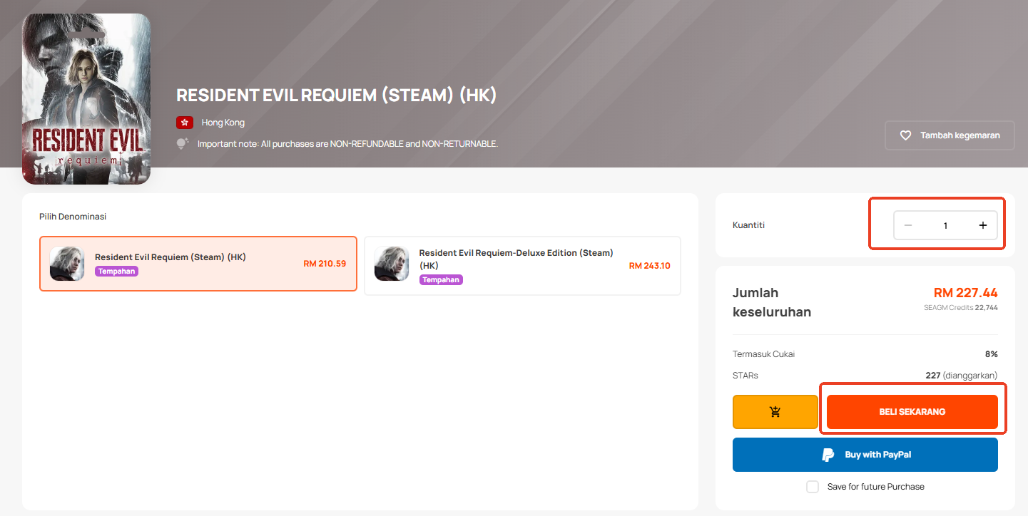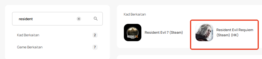 Langkah 1: Log masuk atau daftar untuk akaun dalam SEAGM. Pada menu atas, masukkan kata kunci "Resident" dan cari. Pilih " Resident Evil Requiem (Steam) (HK)".