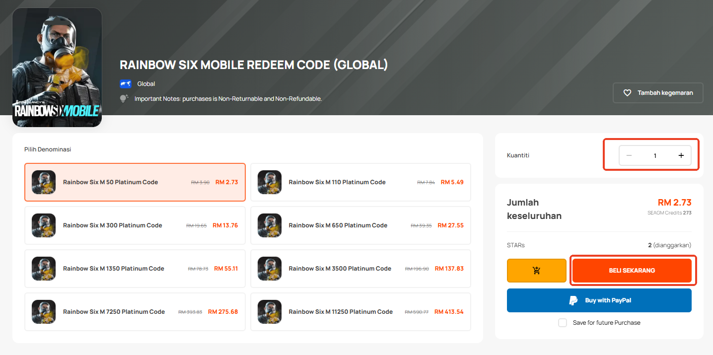 Langkah 1: Log masuk atau daftar akaun dalam SEAGM. Pada menu atas, masukkan kata kunci "Rainbow" dan cari. Pilih "Rainbow Six Mobile Redeem Code (Global)".