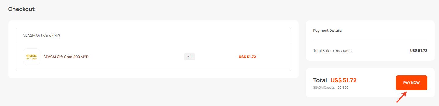 Langkah 1: Pilih produk anda dalam SEAGM, kemudian klik "Bayar Sekarang" untuk dihalakan ke halaman pembayaran.