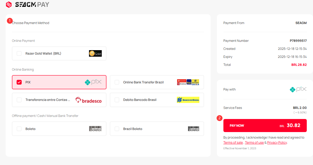 2. Bank Transfer [BRL] payment method is ONLY available for Brazil users under Brazilian real [BRL] in SEAGM.