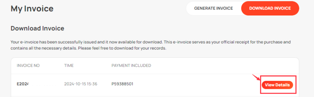 Once the e-invoice is ready, the status will change from [processing] to [view details]. Click on [view details], and you will be directed to a new tab/window.