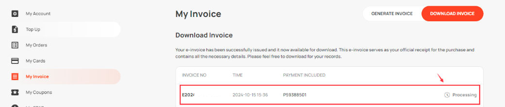 Step 6: Once done, on the top right of the page, click [Download Invoice]. You will see the record of your e-invoice request.
