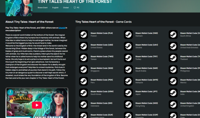 Step 1: Log in/register an account in SEAGM. On the top menu, enter the keywords "Tiny Tales" and search, then select Tiny Tales Heart of the Forest.