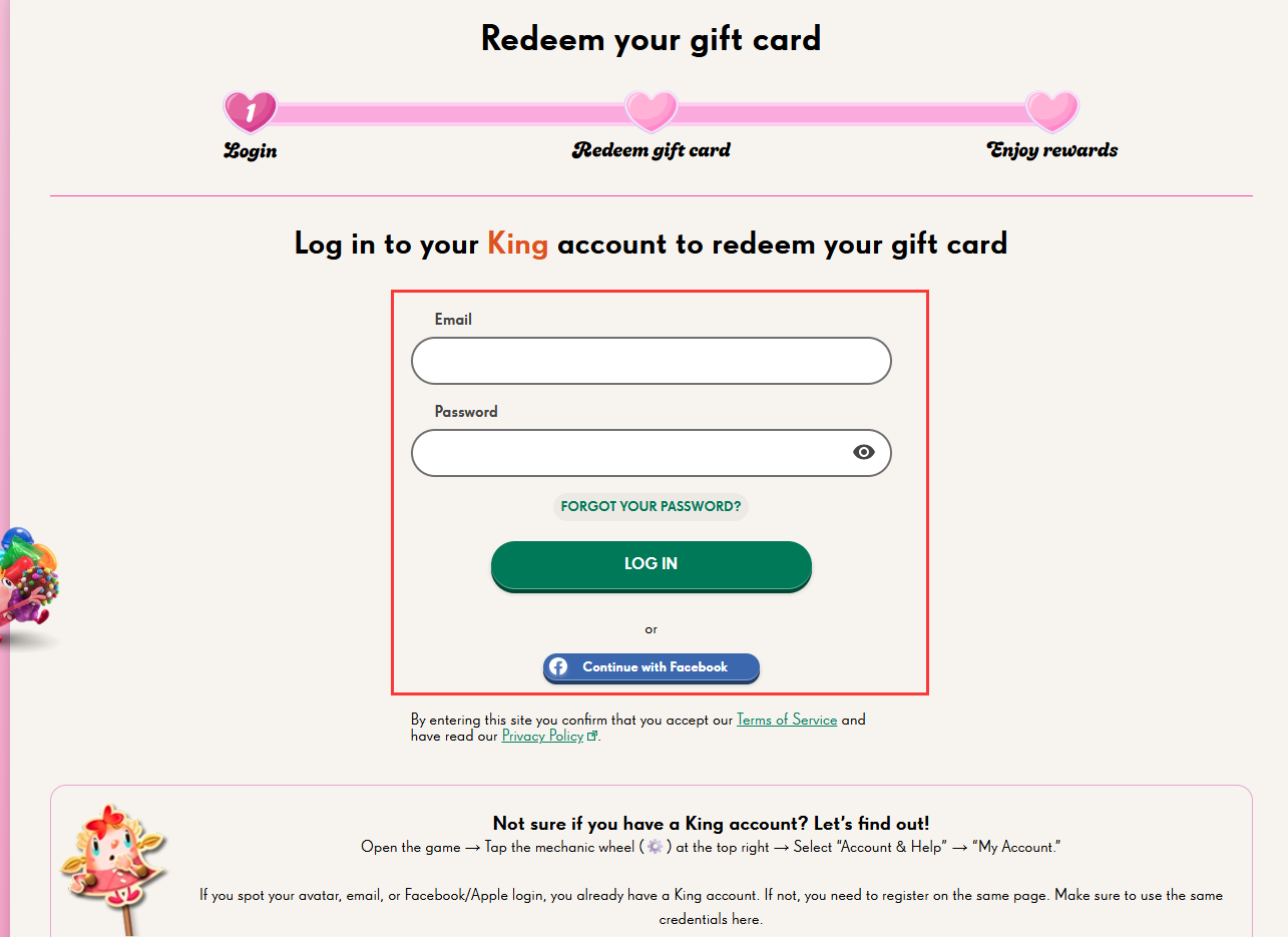 [i] If you don’t have a King account, open your Candy game app and go to [My Account] to create or link one. You can sign in using your email or Facebook. Once your account is set up, return to the King redemption page and log in.
