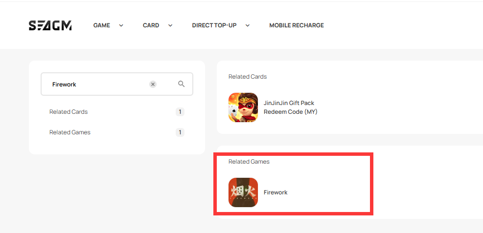 Step 1: Log in/register an account in SEAGM. On the top menu, enter the keywords "Firework" and search. Select "Firework".