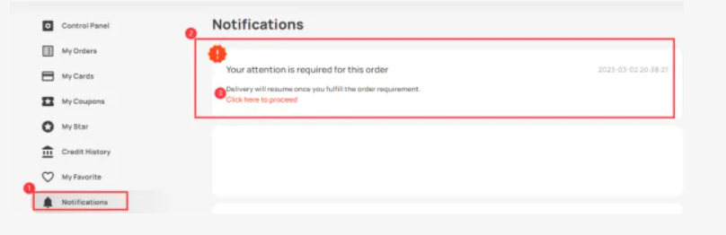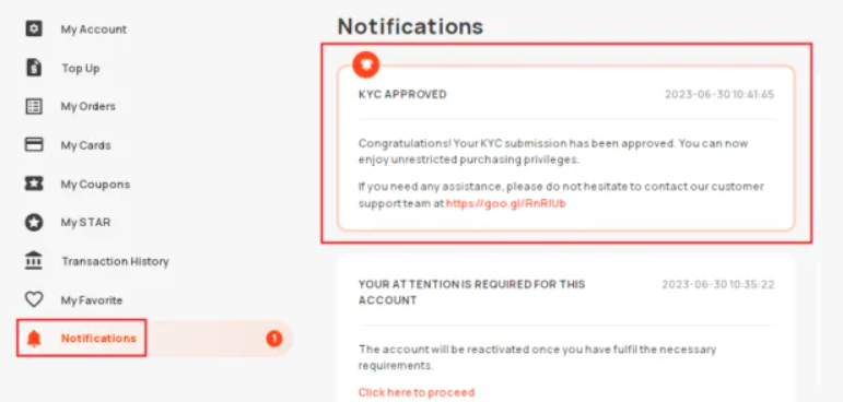 当您的付款被我们的欺诈解决方案系统标记、您的帐户被暂停或我们的系统检测到您的帐户有可疑活动时,您将需要验证您的身份。 一旦您需要执行身份验证,您将在您的 SEAGM 帐户中收到一条通知如下: