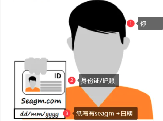 - 持写有【SEAGM+日期】的纸+护照/身份证然后自拍,示例如下: