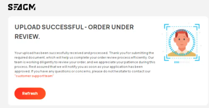 提交所需文件后,通常需要几分钟到 24 小时不等,具体取决于问题。在审查验证过程中,您所有购买的订单都将被搁置,这也包括您的 SEAGM 帐户。一旦团队审核并批准, 您将通过电子邮件或 LiveChat 收到通知。