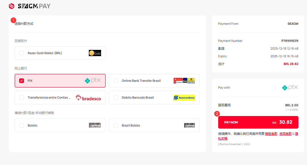 2. 银行转账 [BRL] 付款方式仅适用于 SEAGM 中使用巴西雷亚尔货币[BRL] 的巴西用户。