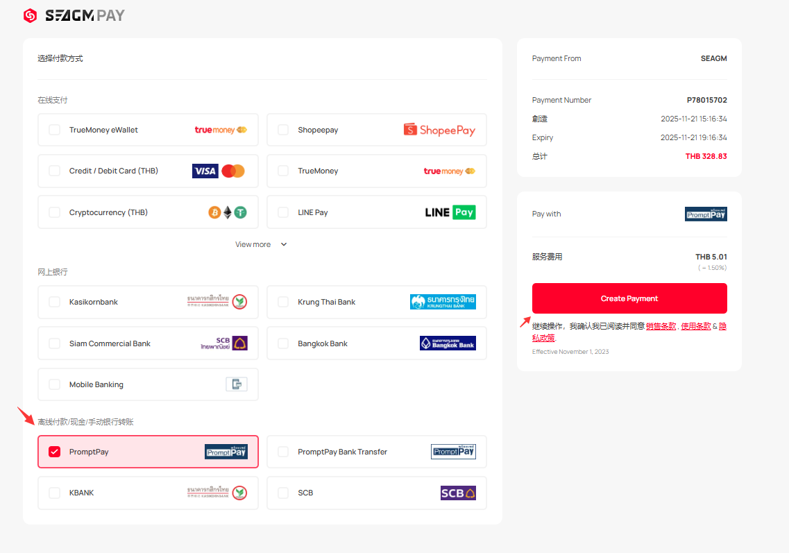 1. Promptpay [THB] 付款方式仅适用于 SEAGM 中泰铢货币 [THB] 的泰国用户。
