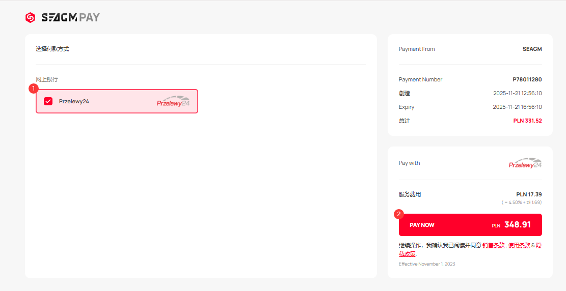 1. Przelewy24payment 方式仅适用于 SEAGM 中波兰兹罗提 [PLN] 下的波兰用户。