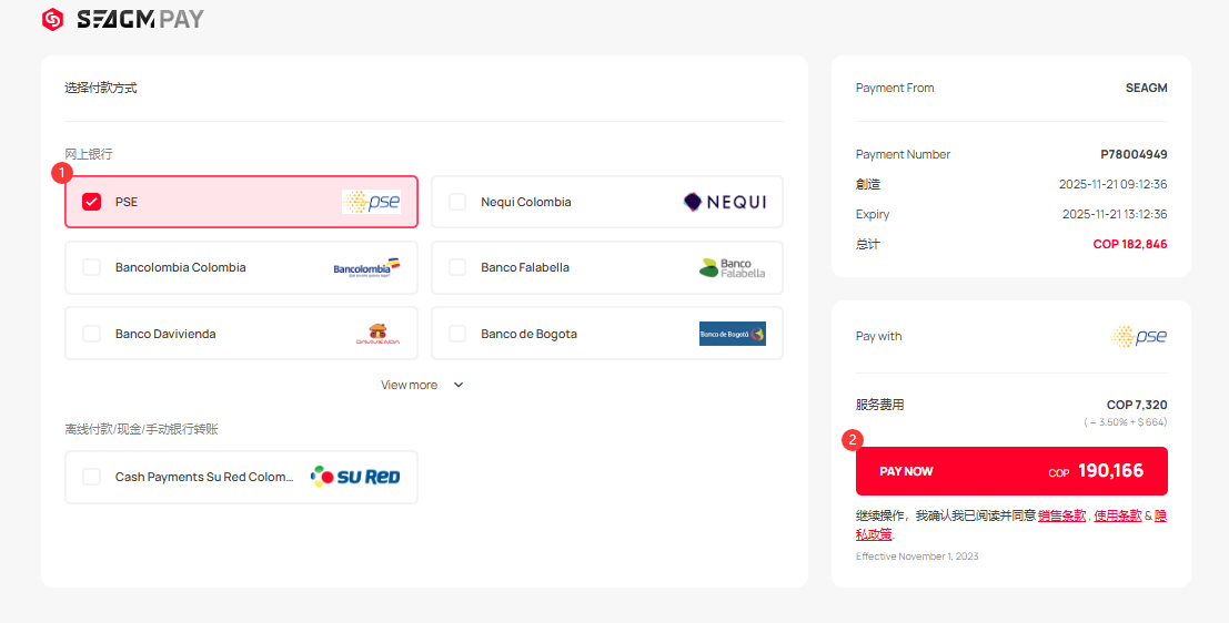 第 2 步:在“线上支付”下选择“PSE“,然后点击“立即支付”继续。