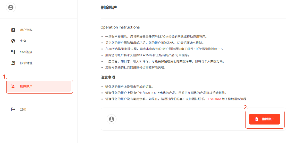 注意:您在所有SEAGM相关平台上的产品信息/订单信息将被删除, 一旦您的账户完全删除,将无法恢复.