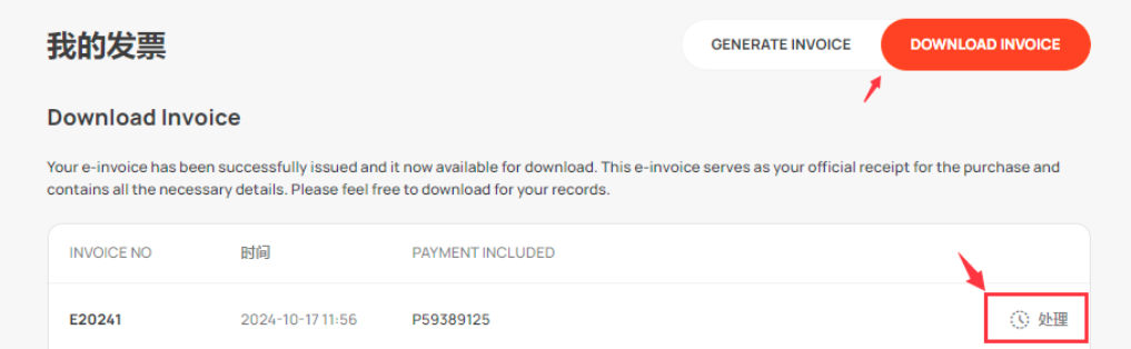 步骤 6:完成后,在页面右上角单击 [下载发票]。您将看到您的电子发票请求记录。