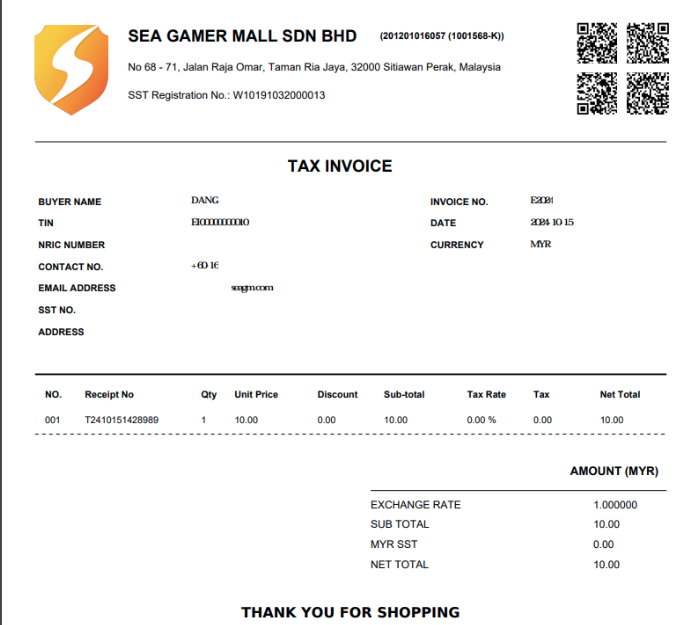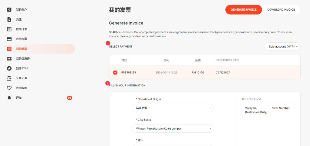SEAGM 电子发票:只有完成的付款才有资格开具发票。每笔付款只能生成一次电子发票。要开具发票,请提供您的税务信息。