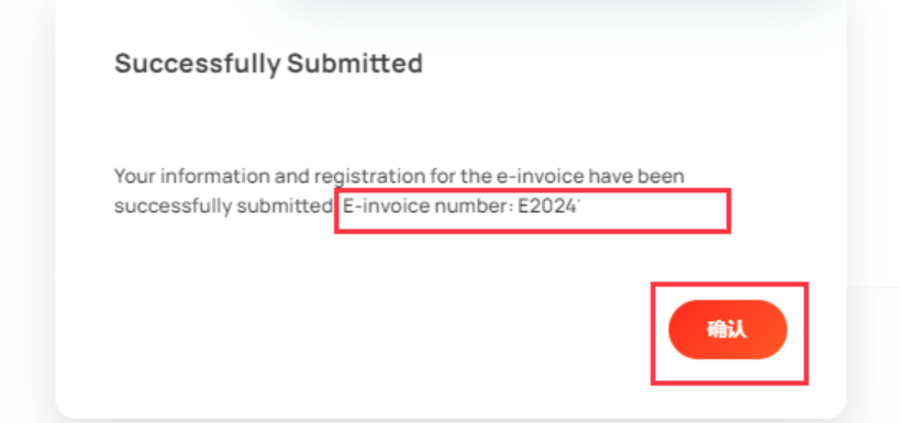 步骤 5:单击 [提交] 后,将弹出提交确认窗口。您将获得电子发票编号以供参考,如有您需要,可以截图以供参考。