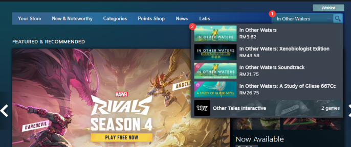 步骤6:成功充值到您的账户余额后,返回主页,搜索[In Other Waters]并选择游戏。