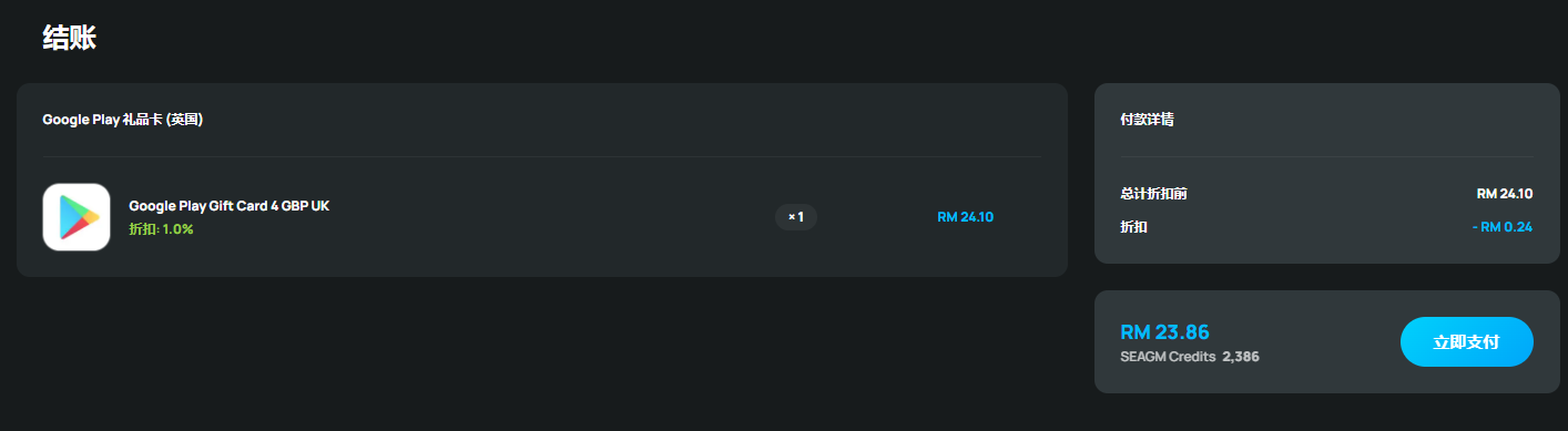 - SEAGM 所售的 Google Play 礼品卡为区域货币锁定卡, 请确保购买礼品卡区域与您注册的 Google 账户区域一致。