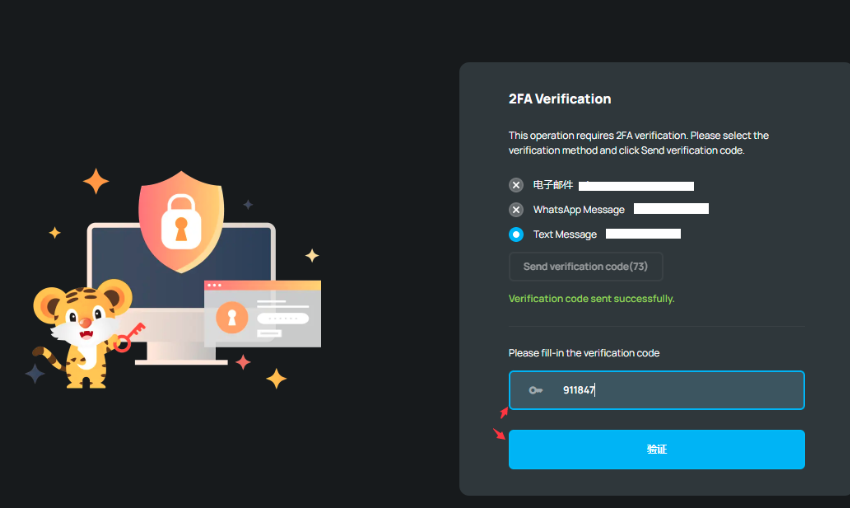 步骤 6:收到验证码后,将其输入到提供的框中,然后点击 验证 继续操作。