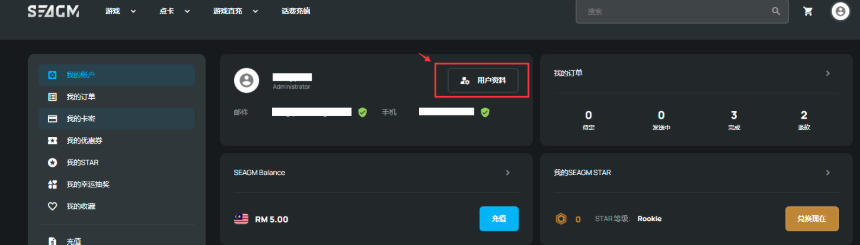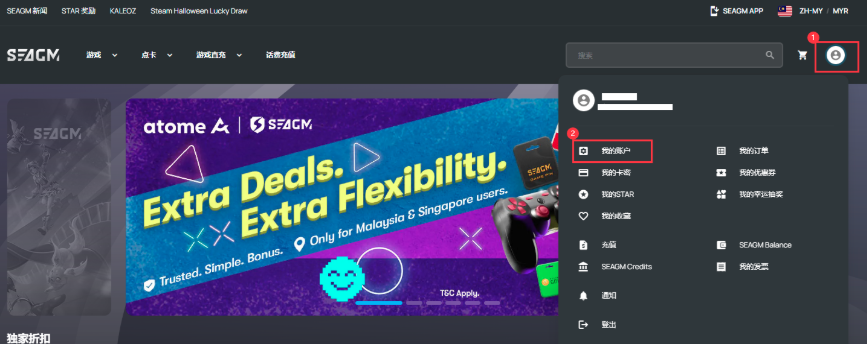 步骤 1:首先登录您的SEAGM 账户。登录后,点击页面右上角的 头像图标,在下拉菜单中选择 “我的账户”。