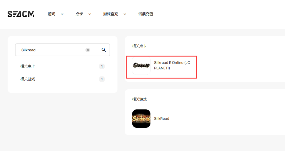 第 1 步:登录/注册SEAGM帐户。 在顶部菜单中输入关键字“Silkroad”并搜索。 选择“Silkroad R Online [JC Planet]"。