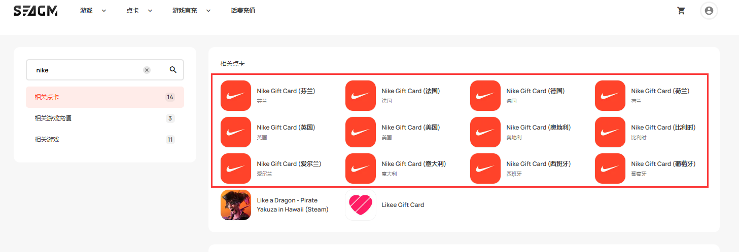 - SEAGM出售的耐克礼品卡为地区货币锁定卡。