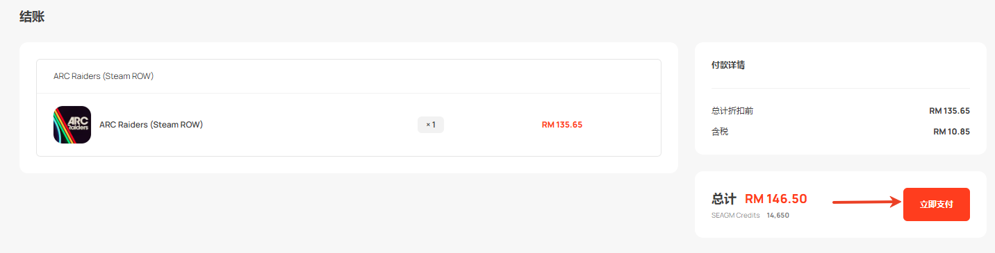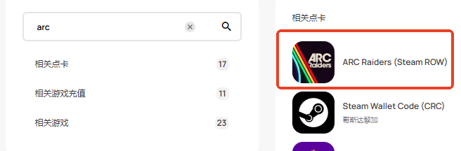 第 1 步:登录/注册 SEAGM 帐户。 在顶部菜单中,输入关键字 “Arc” 并进行搜索。 选择 "ARC Raiders (Steam ROW)”。