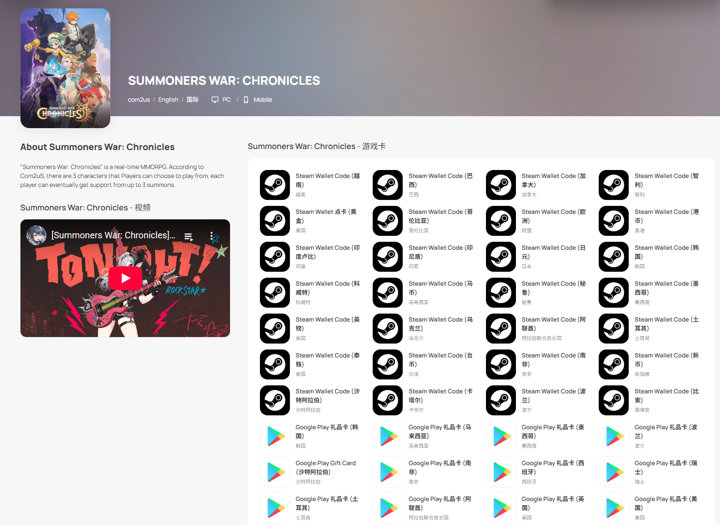 第 1 步:登录或注册SEAGM 账号 ,在顶部菜单输入关键词 “Summoners” 进行搜索,选择 “Summoners War: Chronicles ”。