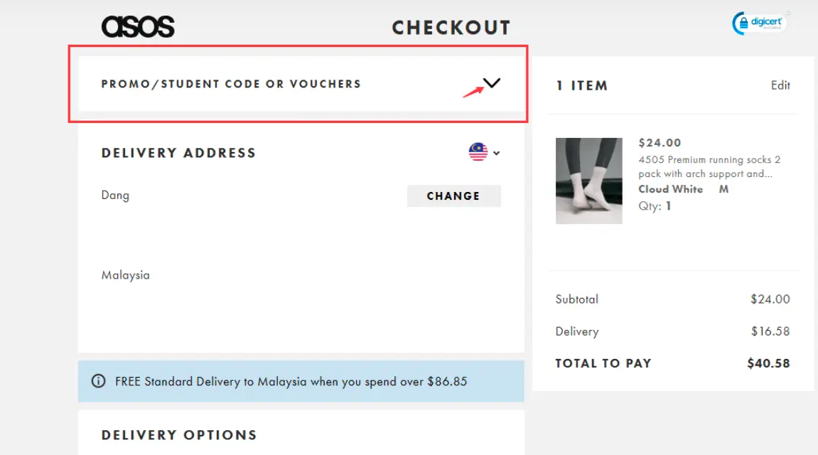步骤 6: 添加礼品卡后即可开始购物。在结账页面,前往 [Promo/Student Code or Vouchers] 栏,将礼品卡余额应用到订单中。