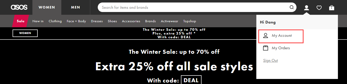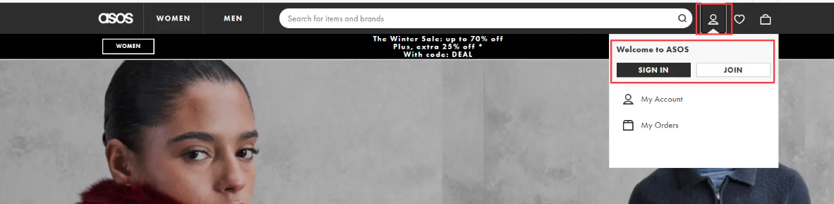 步骤 2: 访问ASOS 官方网站并登录账号,若没有账号请先注册新账号。