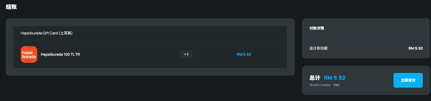 第 1 步:登录/注册 SEAGM 帐户。 在顶部菜单中,输入关键字 “Hepsiburada” 并进行搜索。 选择 "Hepsiburada Gift Card (土耳其)”。