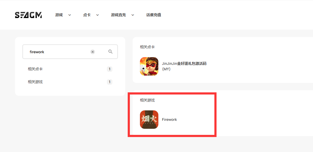 第 1 步:登录/注册 SEAGM 帐户。 在顶部菜单中输入关键字"Firework”并搜索。 选择"Firework"。