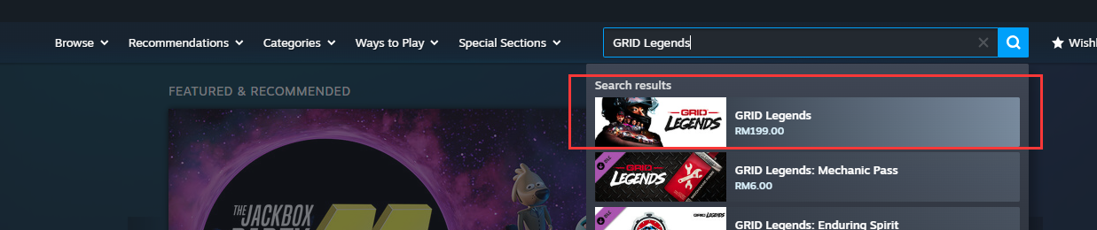 步骤6:成功充值到您的账户余额后,返回主页,搜索[GRID Legends]并选择游戏。