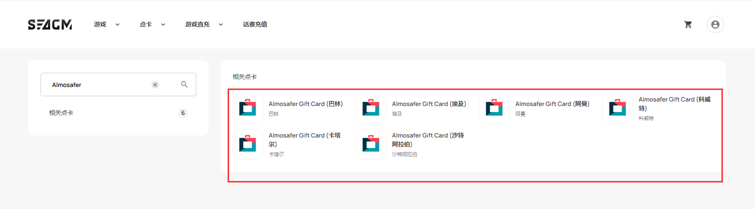 第 1 步:登录/注册SEAGM帐户。 在顶部菜单中输入关键字“Almosafer”并搜索。 选择“Almosafer Gift Card [根据您的账号地区]"。