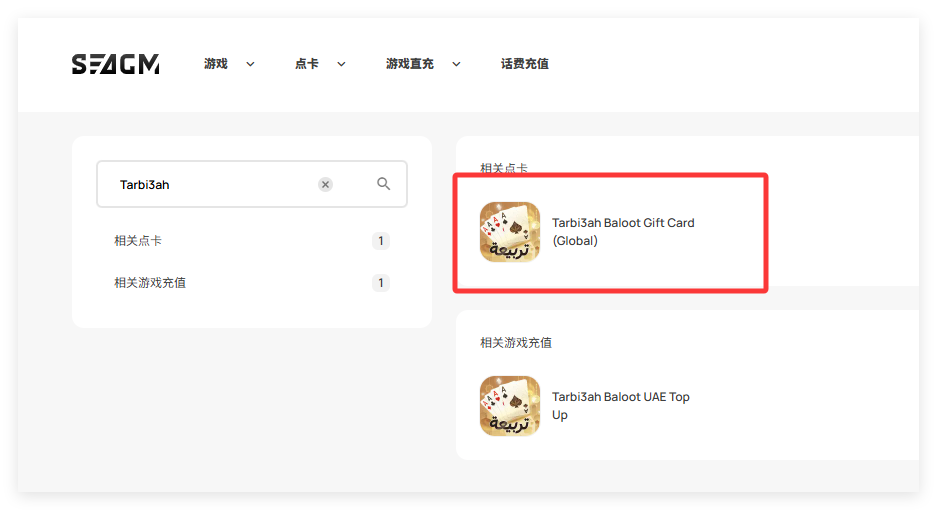 第 1 步:登录/注册SEAGM帐户。 在顶部菜单中输入关键字“Tarbi3ah”并搜索。 选择“Tarbi3ah Baloot Gift Card [Global]"。